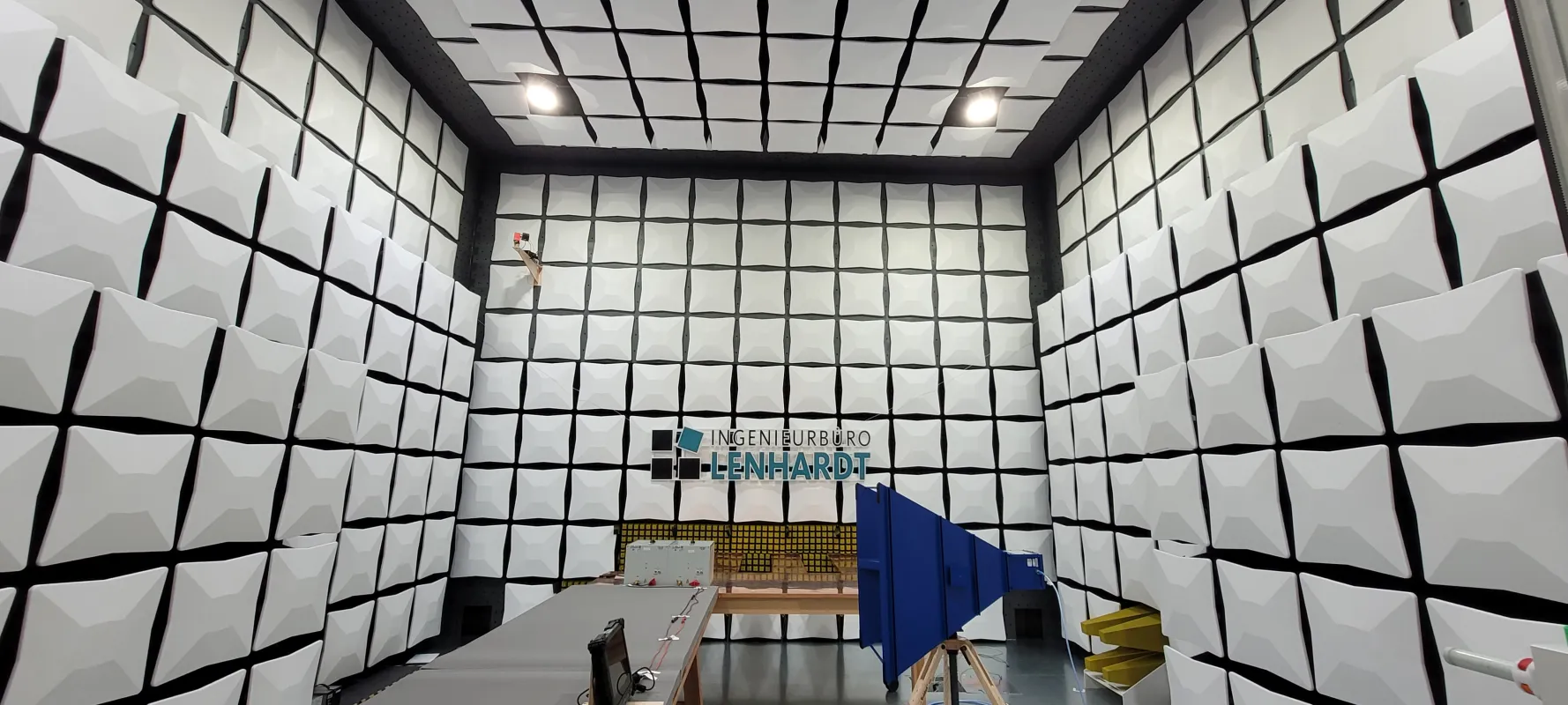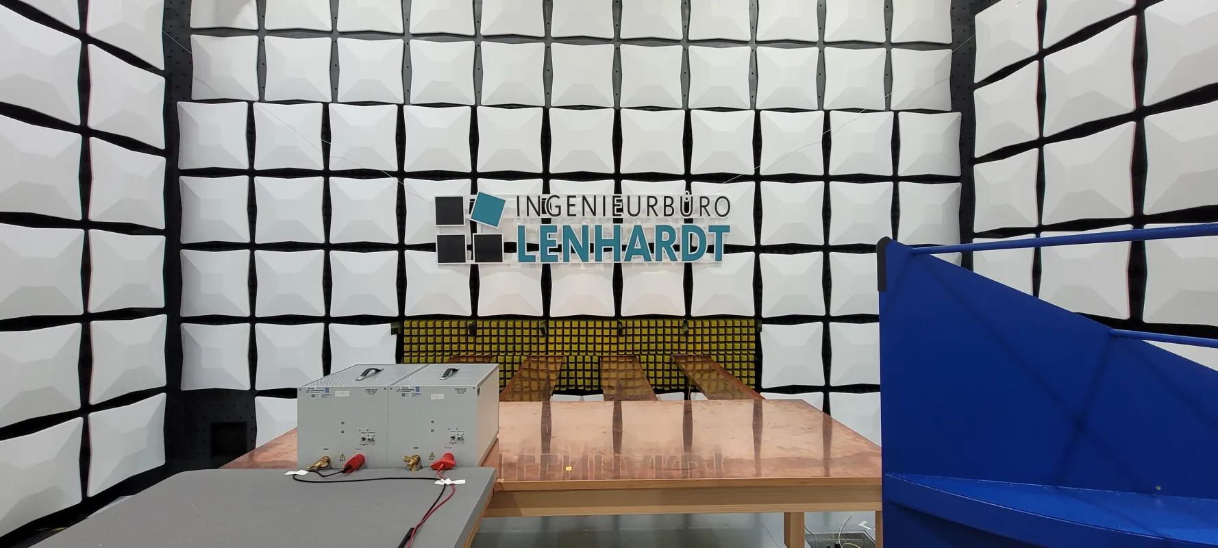 Capacités d'essais accrédités DAkkS de bout en bout : chambres anéchoïques et semi-anéchoïques, salles blindées en cuivre et plans de masse