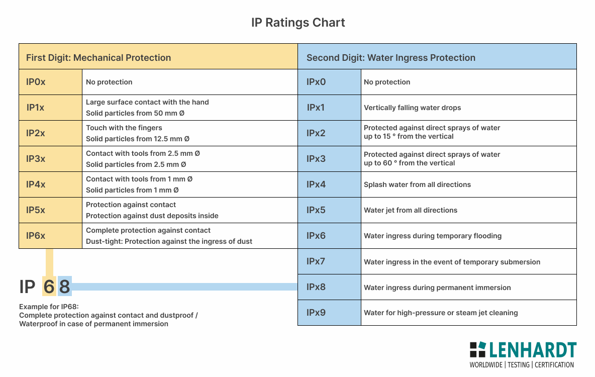 The IP code, also known as IP protection class, consists of two digits that indicate the degree of protection of a device against harmful influences. The first digit stands for protection against foreign bodies and contact (0-6), while the second digit describes protection against moisture and water (0-9). The combinations are specified in the DIN EN 60529 and ISO 20653 standards.